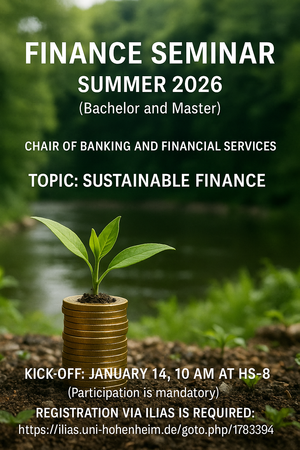 In the upcoming summer semester of 2026, the Chair of Banking and Financial Services will offer a combined Bachelor’s and Master’s seminar on the topic of Sustainable Finance.